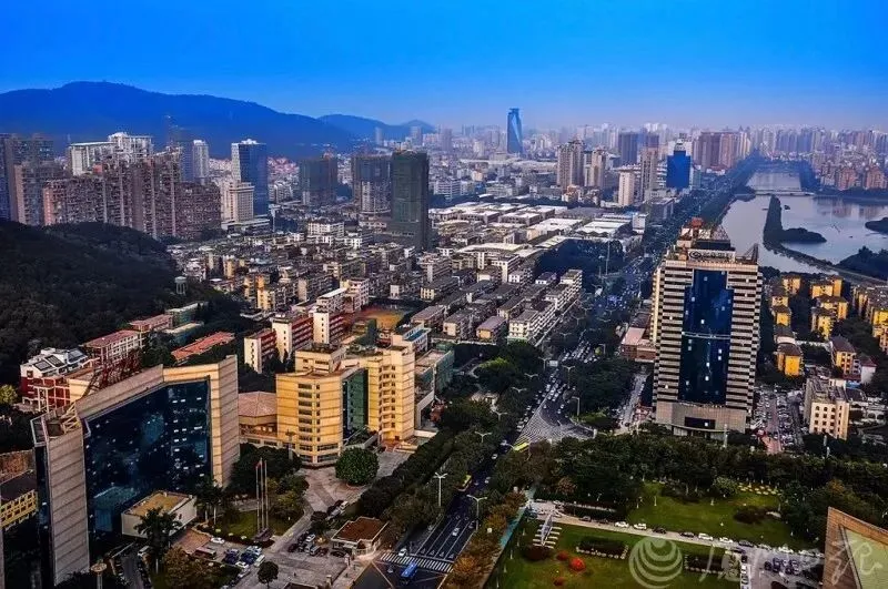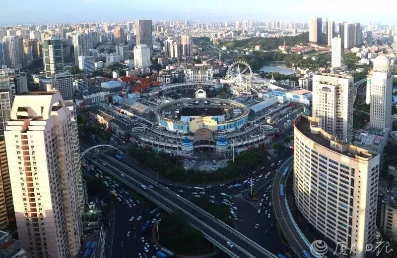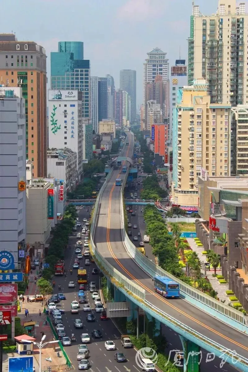2018年,从仙岳山相似角度望去,如今的海天路周边高楼林立,繁华熙攘。鹭辉大厦(图左橙色建筑)、海天大厦已不再鹤立鸡群。海天路也早隐进楼群当中。(本报记者 郑晓东 摄)
