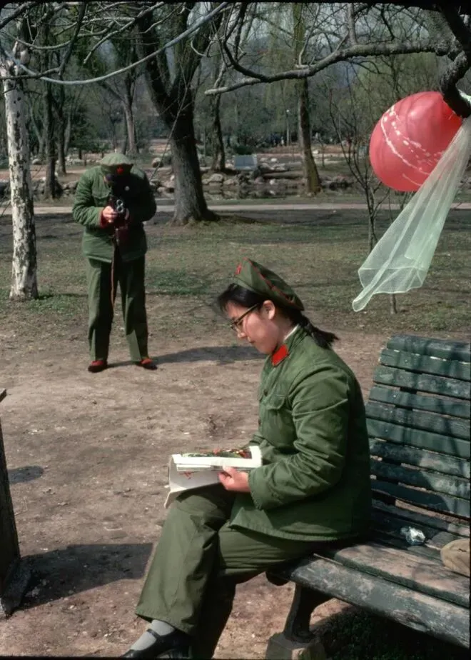 西湖边的长椅上,端坐着一位看书的解放军女兵,一旁另外一位解放军正在给她拍照。也许,他们是恋人关系吧。