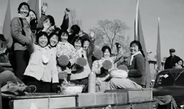这个木牌子上写着大字,意思大家都懂,红围巾一打结就服帖,手里还抱着一张相片,周围人把她簇在中间,嘴巴张开像在唱一句口号,那时候的热乎劲儿,是从心里往外冒的。