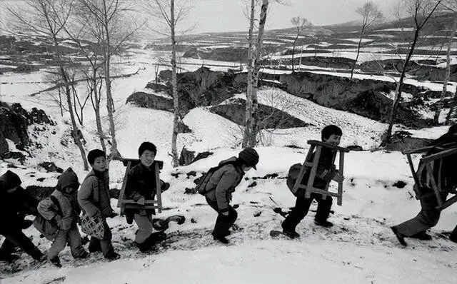 那时候条件差 , 教室里就几张破桌子 , 凳子不够 , 学生自己从家搬。 小短腿扛着大板凳 , 走几里山路 , 这场景现在的孩子根本想象不到。
