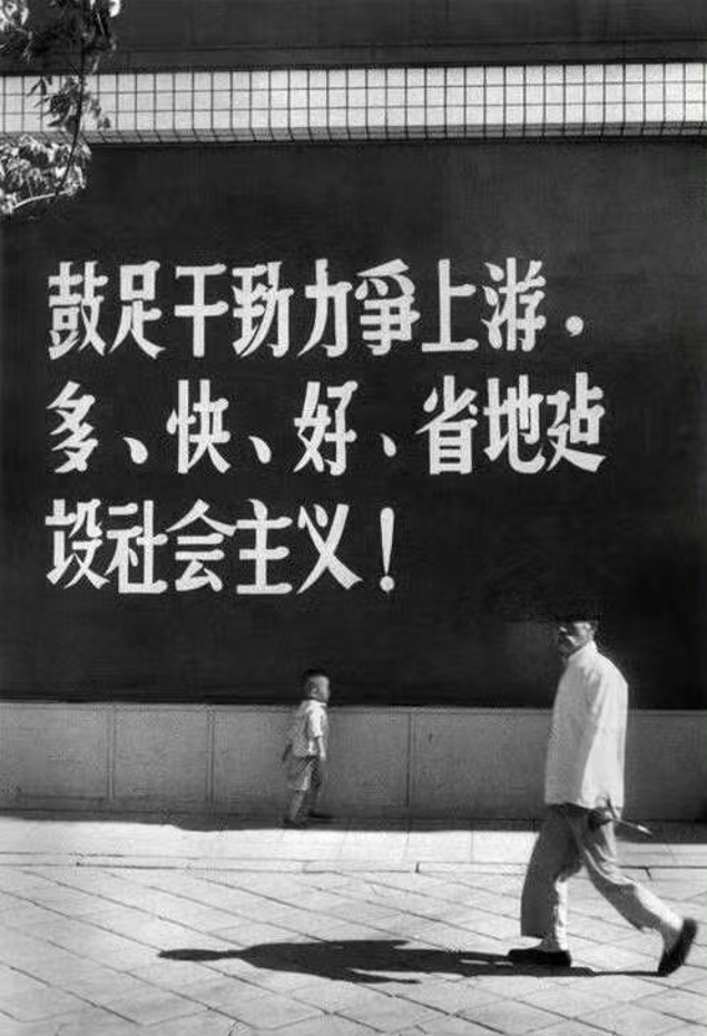 黑白影像中,一面墙体上的“鼓足干劲力争上游,多快好省地建设社会主义”标语格外醒目,行人步履匆匆掠过,时光仿佛在这帧画面里凝固。