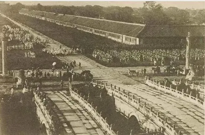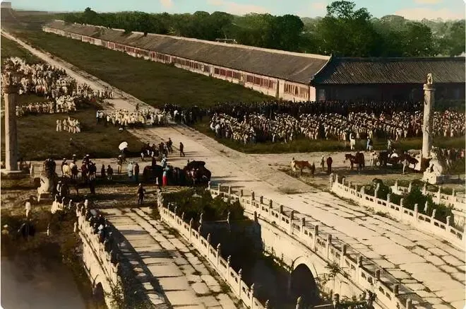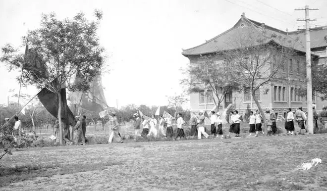 1928年的这张照片,定格了学生们抗议“济南事件”的游行瞬间。画面里,开阔的场地旁立着几株树木,枝叶在晴日下舒展。远处,带有传统韵味的建筑静静伫立,瓦顶与墙垣勾勒出沉稳的轮廓,却难掩场地上涌动的激昂情绪。