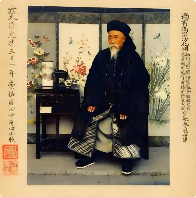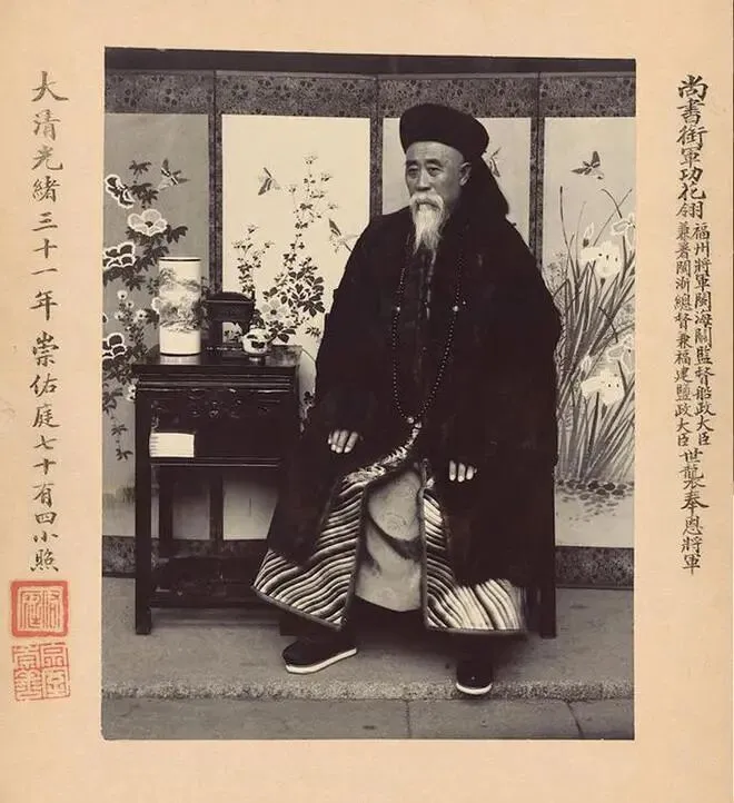 这是清代光绪三十一年(1905年)七十四岁的福州将军崇善的肖像照。画面中,他身着清代高级官员规制的服饰,身旁深色实木案几雕刻精致,案上摆有花鸟纹饰瓷器,背景屏风亦饰以花鸟图案,陈设尽显清代官宦典雅格调。照片左右题字标注其“尚书衔军功花翎”“福州将军”等多重要职,尽显庄重威严。