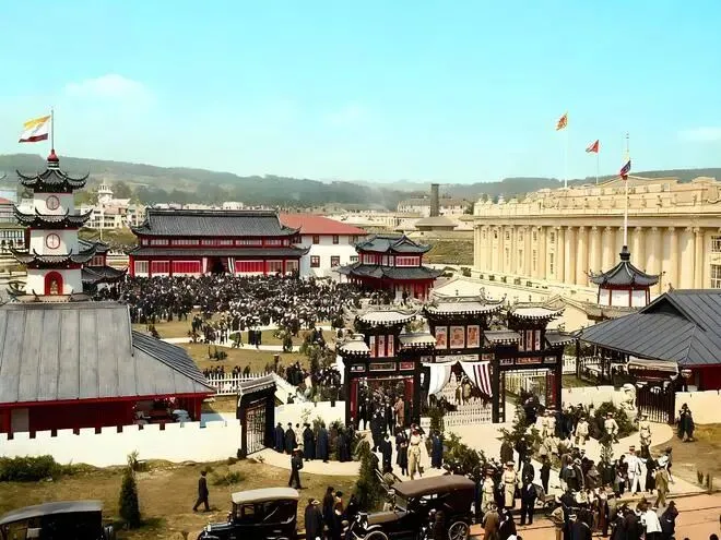 1915年,巴拿马世博会的中国馆,中国馆以典型中式传统建筑为核心,飞檐翘角如振翅禽鸟,朱红立柱、金黄彩绘在天光下鲜亮夺目,牌坊式门楼雕满繁复吉祥纹样,尽显东方建筑的典雅瑰丽。