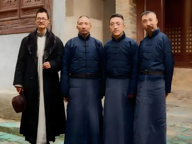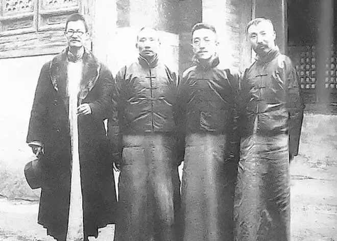 1920年早春的西山卧佛寺,黛瓦覆顶的禅院厢房静静矗立,画面中四人并肩而立,衣袂间裹着早春的清寒,却透着文人的儒雅从容。右一是李大钊、右二是胡适、右三是蔡元培、右四是蒋梦麟,四人并肩时,彼此间的距离透着知己相聚的松弛。