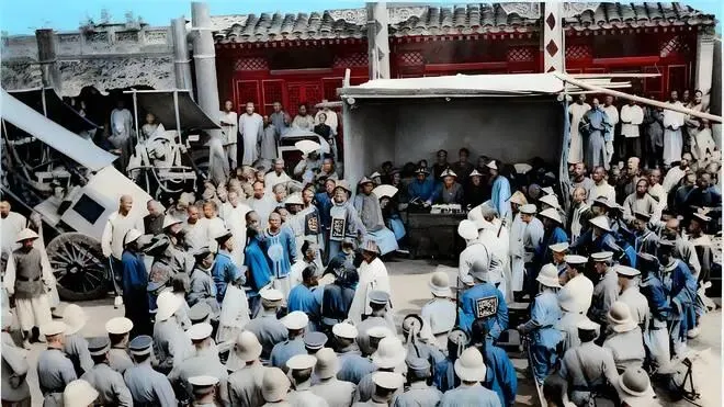 1900年八国联军侵华后,这张照片定格了列强镇压义和团、清政府参与审判的一幕。画面中间,一座用枯黄芦苇席仓促搭起的棚子格外扎眼,棚下置着桌案,身着清代官服的监斩官正进行判决。