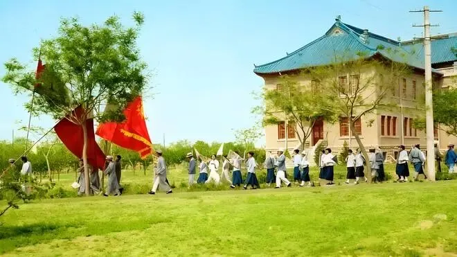 学生们排成队伍行进着,多数人身着朴素的白衣黑裤,身影透着青春的挺拔与坚毅。他们高举着旗帜与标语,旗帜色彩鲜明,似燃着对侵略的怒火,队伍里满是悲愤与不屈的气息。