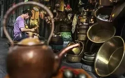 以前铜匠挑着担子 , 手里摇着铜片 , 叮叮当当响 , 老远就能听见。 修铜锁、补铜器、打铜壶...