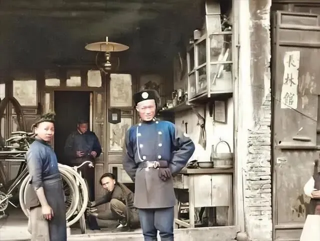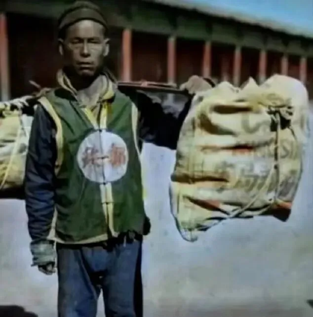 这位是晚清的邮差 , 衣服上写着"邮"字 , 肩膀扛着邮包。 那时候没有汽车火车 , 全靠人力和牲口 , 送封信得走多少路啊。