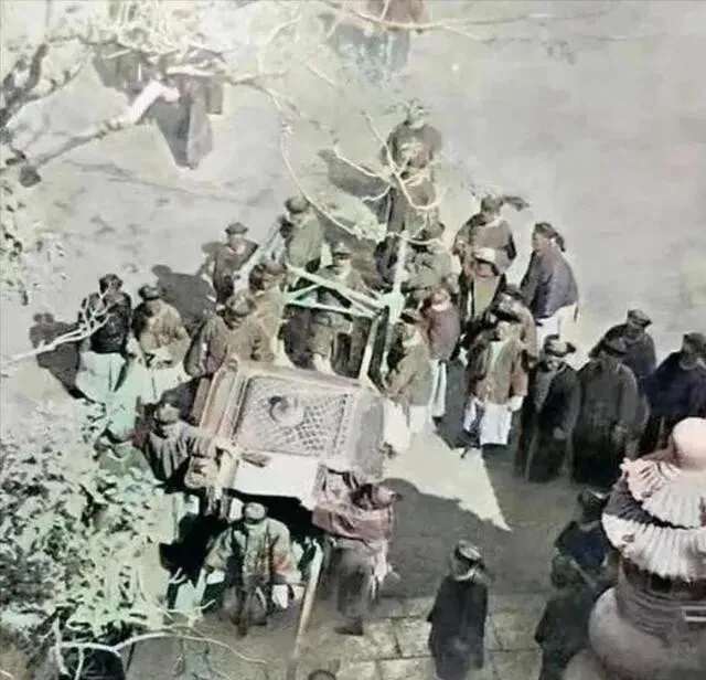 据说这是光绪帝唯一留存的照片 , 画面不太清晰 , 但能看出来官员们前呼后拥 , 光绪从轿子里出来。