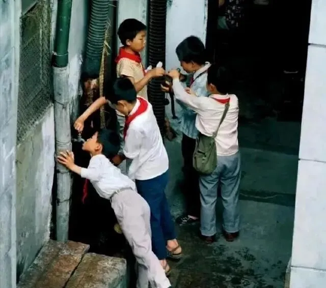 跑到学校外边老百姓家里喝 , 邻着学校那几户人家 , 家家备着一口大缸 , 提前盛满井水 , 缸里放一个葫芦做的水瓢。