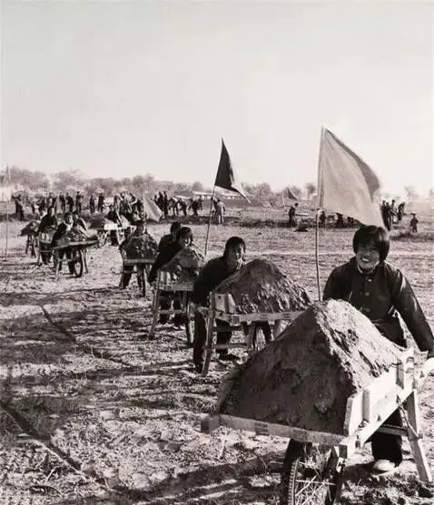 推独轮车运土 , 一车一车地推 , 热火朝天的。 那时候干活 , 拼命干 , 比着干 , 谁也不服谁。