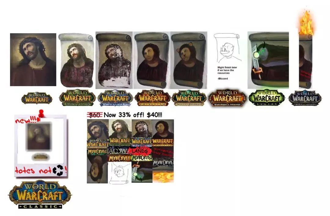 我们且不说《魔兽世界》玩家由爱生恨,吐槽它的剧情神展开,在许多人眼里,一款延续了十几年生命的网络游戏,经过多次迭代,显然就像图中这个梗一样,它的形象是越来越模糊的。