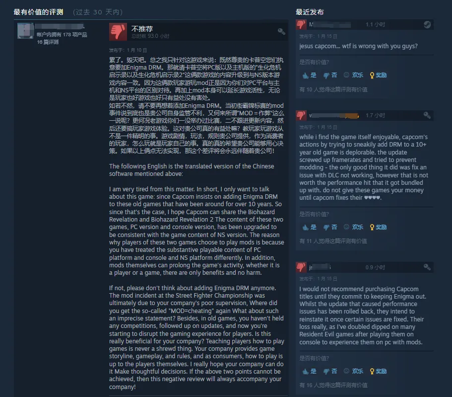包括卡普空的街机游戏合集、《洛克人》合集、《街头霸王30周年纪念合集》、《出击飞龙》、《生化危机5》和《幽灵诡计:幻影侦探》,都已经实装了新的DRM措施。目前这一列表中大部分游戏或游戏合集的近期好评率都不怎么好看,就连没有实装DRM的少数较新的游戏都受到了牵连。