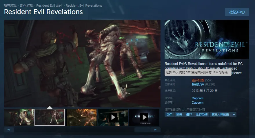根据SteamDB网站的记录,在2013年登陆Steam的卡普空老游戏《生化危机:启示录》,突然于1月9日公布了一个更新。这次更新将《生化危机:启示录》的30天内好评率拖到了18%。