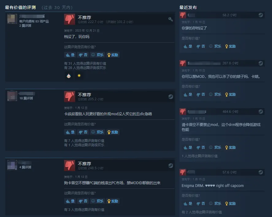 来自社区的差评警告,正在督促卡普空以更加理性和开放的态度对待模组问题,挽救模组作者的心血,以及卡普空的冷饭生意。