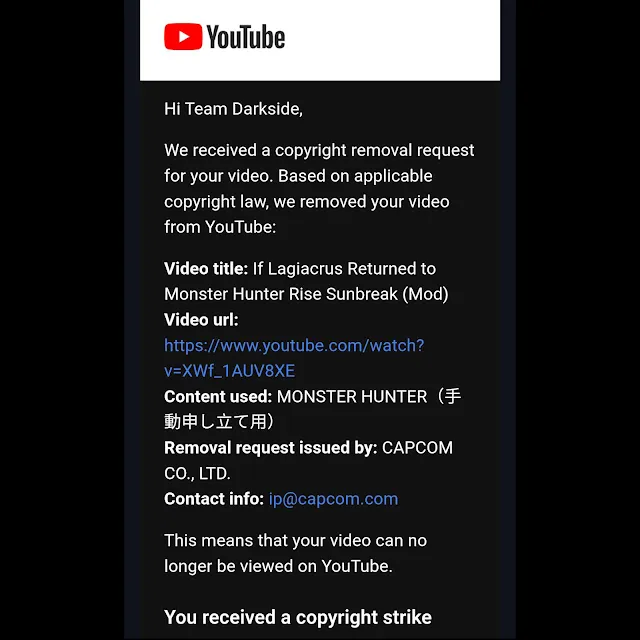 在上传视频的几天前,卡普空就给《洛克人EXE》合集实装了Enigma Protector。上传视频两个月后,知名《怪物猎人》速通与内容创作团队Team Darkside表示,卡普空日本的法律团队正在针对《怪物猎人:崛起》任何涉及模组使用的视频发出下架请求和版权警告。