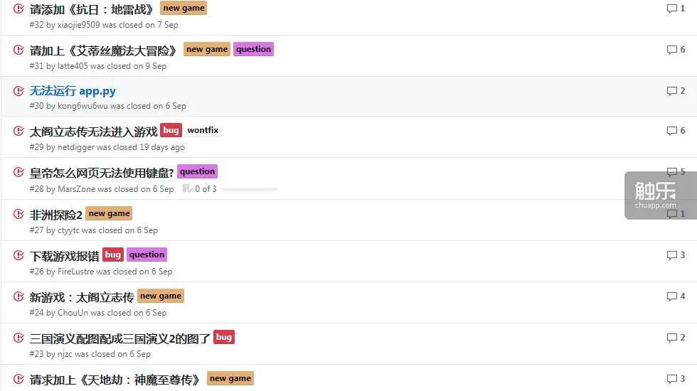 但紫菜个人时间精力有限,后续批量导入的1800款游戏,他做不到一个个检查调试,也没法保证都能正常运行,其中不少游戏还没有中文版。紫菜希望借GitHub的“开源共享”精神,让更多网友参与到这个项目中来。