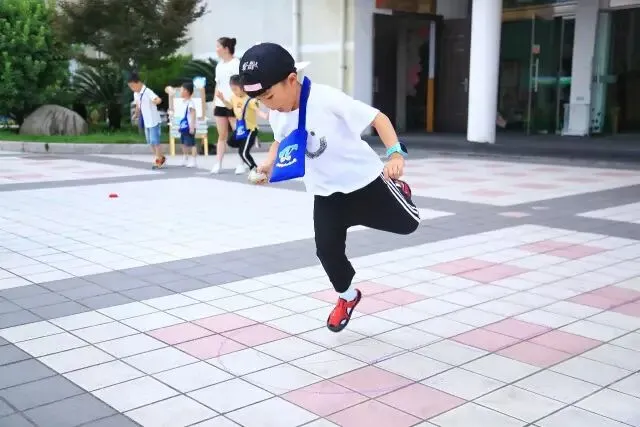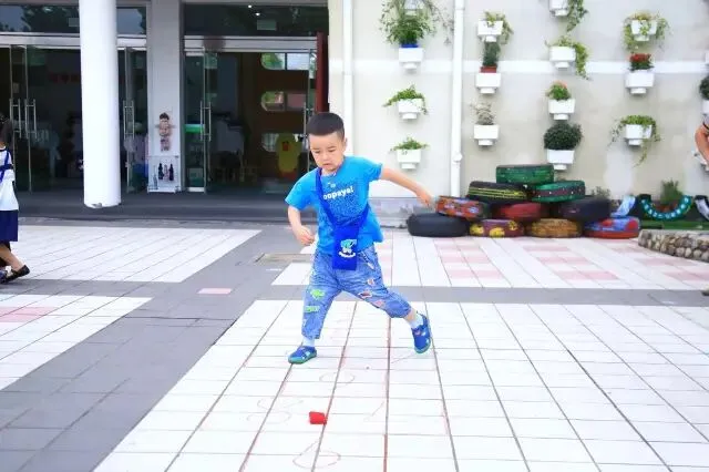 接着用单脚跳进第三格,这样单脚、双脚地交替踢布沙袋,直到布沙袋踢出第六格,双脚跳出第六格,算一次成功,然后再从第一格重新做起。若在某格失误,可在下一轮时,从失误格做起。