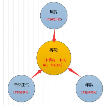 经验可以通过在线打坐获得,也可以通过打怪获得,也可以通过等级判定高级技能是否开启。这其实是把上述游戏的 年龄,浩然正气,境界,三个概念合在一起的结果,使概念更加精简,而玩家通过等级的划分,更容易找到自己在什么时候该干什么的目标,更容易进入心流体验。