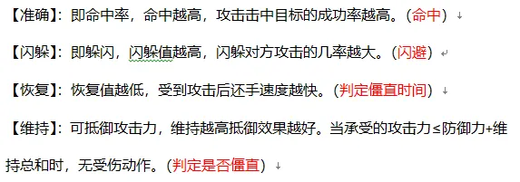 【准确】:即命中率,命中越高,攻击击中目标的成功率越高。(命中)
