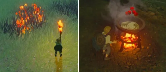 以游戏中的最常见的火焰为例。你第一次听神秘老人讲课的时候,就只是拿着树枝将火焰从一个火堆传到另外一个火堆而已。但仅仅在新手的大高地区,你就能学会火焰系统的另外五、六个互动用法:用金属物品互相撞击会产生火花,用金属物品撞击燧石也会;放在火堆旁边的所有食材都会变成烤制食材;点燃草地以后,火焰会沿着风向一路烧过去,烧光路上的所有敌人;普通弓箭穿过火堆就会变成火箭,可以用于点燃爆炸桶;木制武器可以点燃提高威力,但也会损失耐久度;在水边不能点火,在冰块边点火可以融化冰块……随着你离开新手区,不停解开一个又一个神殿的谜题,你会发现火其实还有更多神奇的解谜方法。