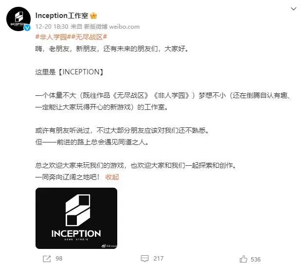 比如在12月20日,游戏的研发商Inception工作室突然发布了一条微博,并称自己是一个“体量不大梦想不小”还在倒腾自认有趣能让大家玩的开心新游戏的工作室。
