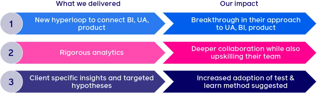 IGG用户获取与商业智能团队和Facebook Gaming 之间的密切协作,使得用户获取 (UA)、商业智能 (BI) 和产品这三个环节之间得以被打通,成功构建出了一个各方均能参与其中的超级闭环,更取得了成绩。