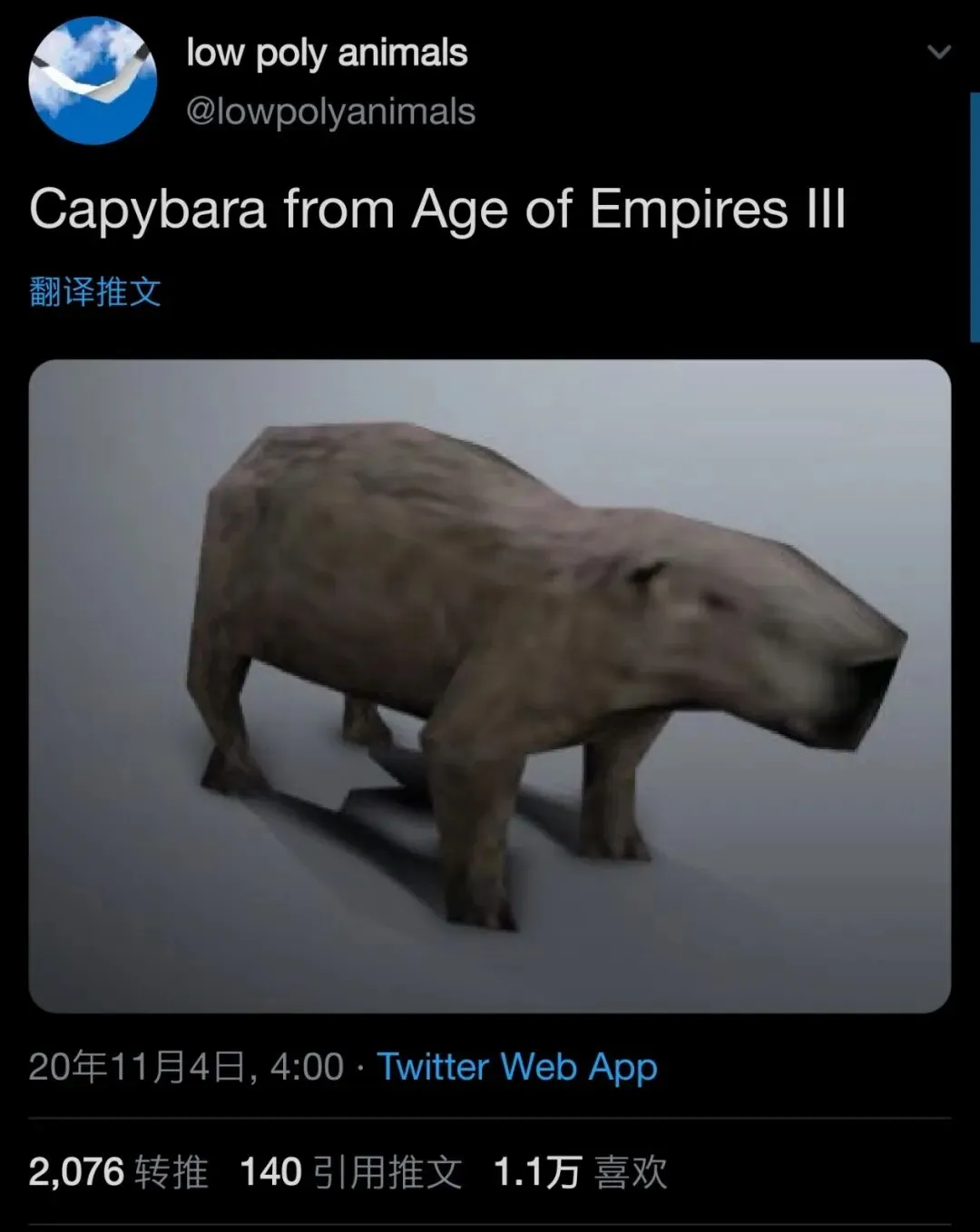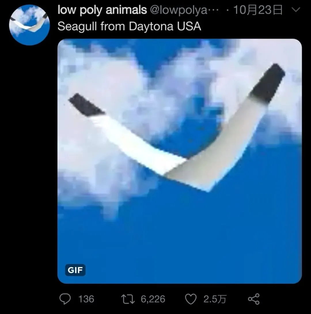 上个月,推特上出现了一个名为Low Poly Animals 的账号,专门发布游戏中的低多边形动物,建号仅两周就已经有了4.5万的粉丝了。