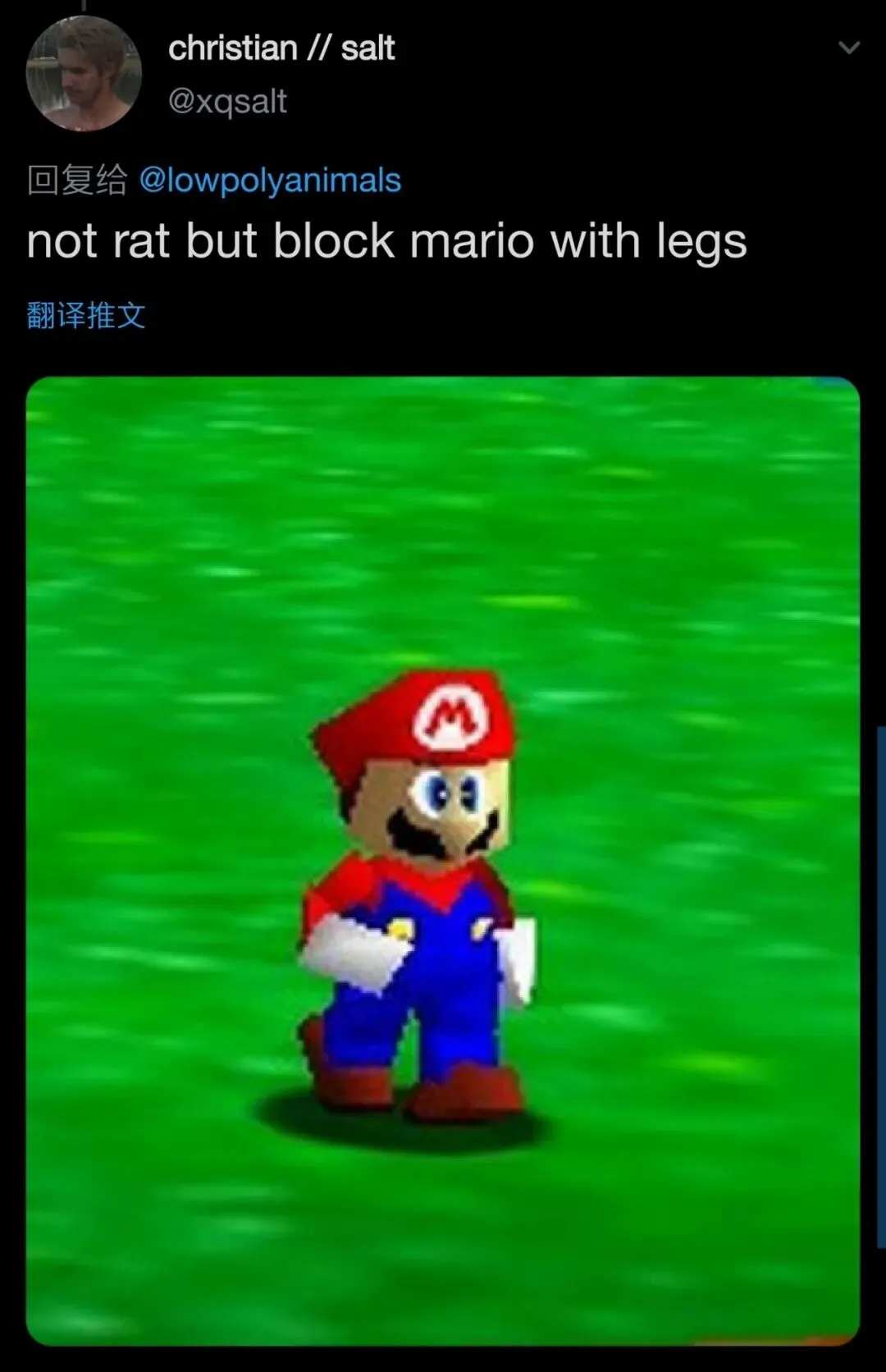 随着接力的继续,人们逐渐歪楼并脱离了最初野生动物的范畴,于是广义的说马里奥也可以算作低多边形的动物。