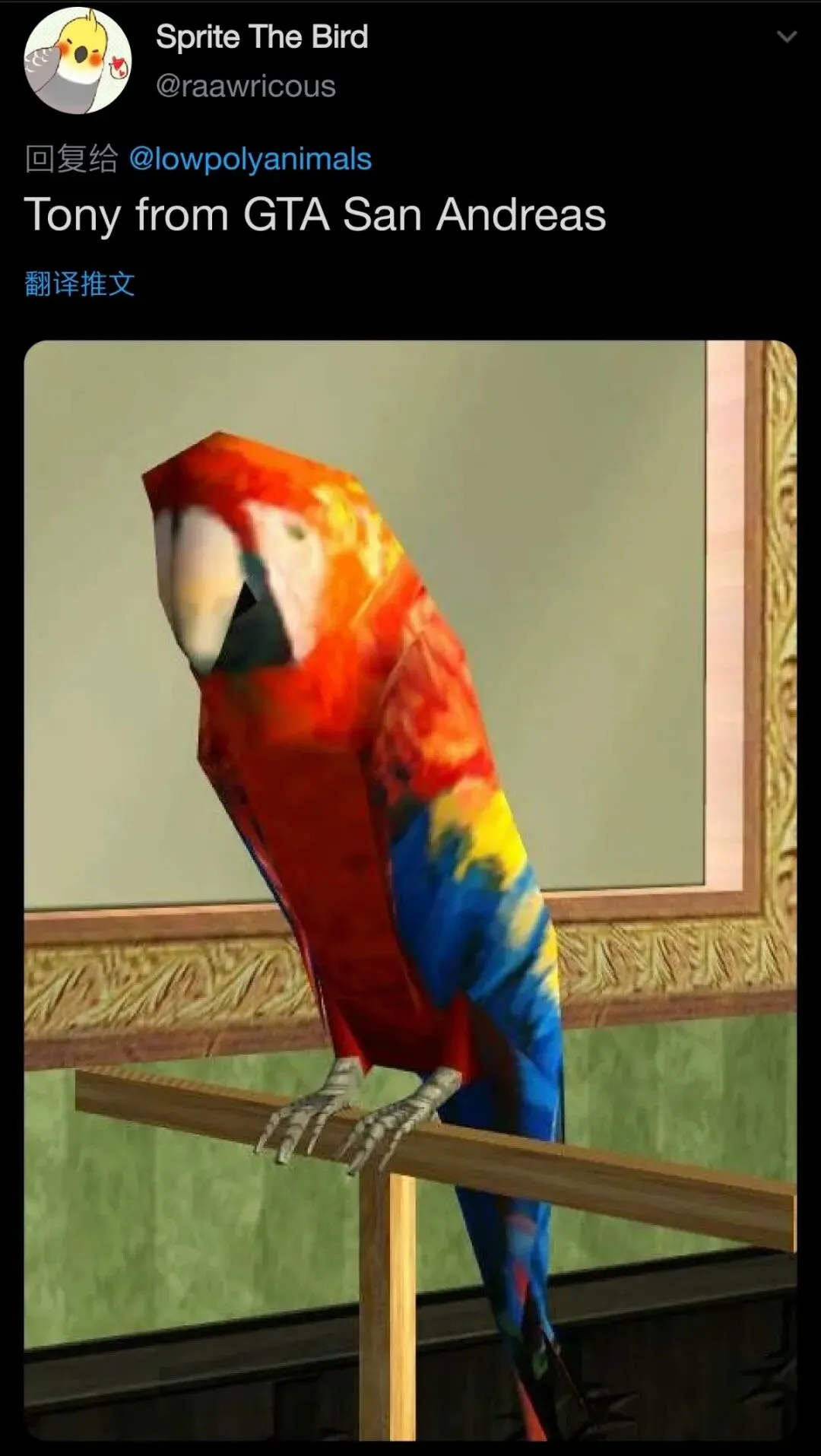 《GTA:圣安地列斯》中口吐芬芳的鹦鹉Tony,近看有一张人间不值得的脸。