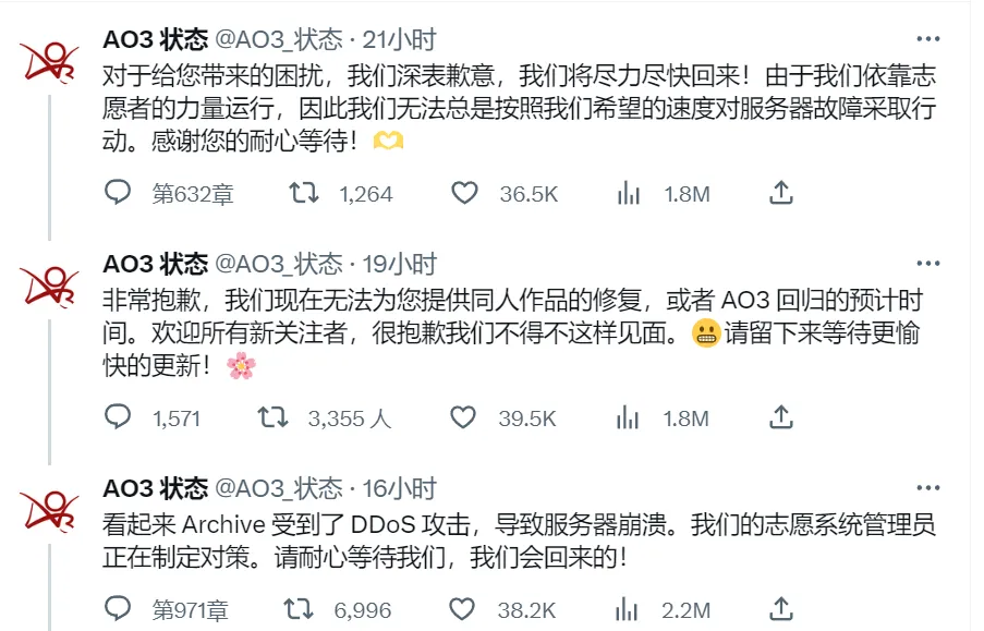 著名同人网站AO3昨天遭受了DDoS攻击,网站访问困难。