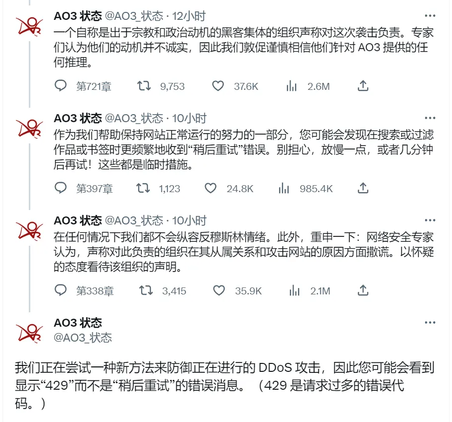 不过AO3运营方对黑客组织的动机表示怀疑,同时也在积极采取对策,看起来并无向黑恶势力屈服之意。