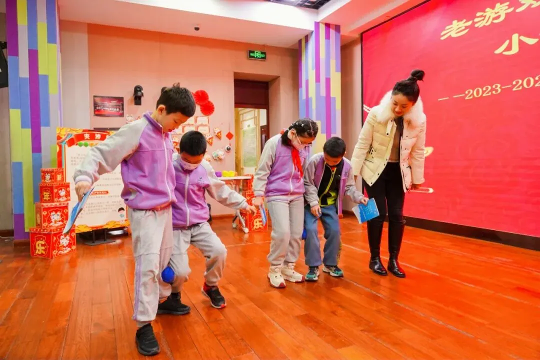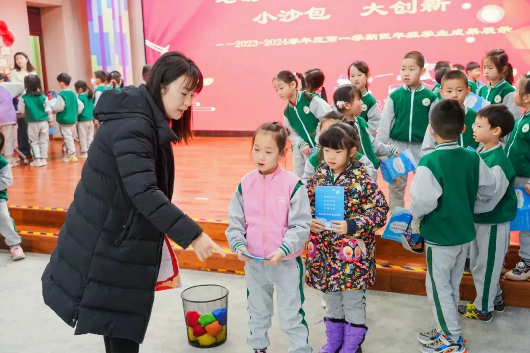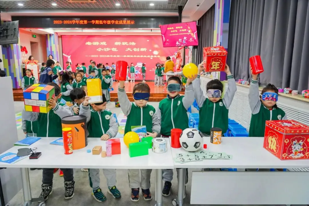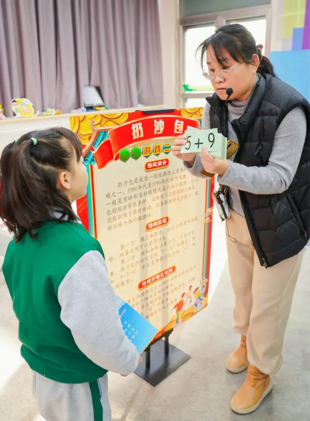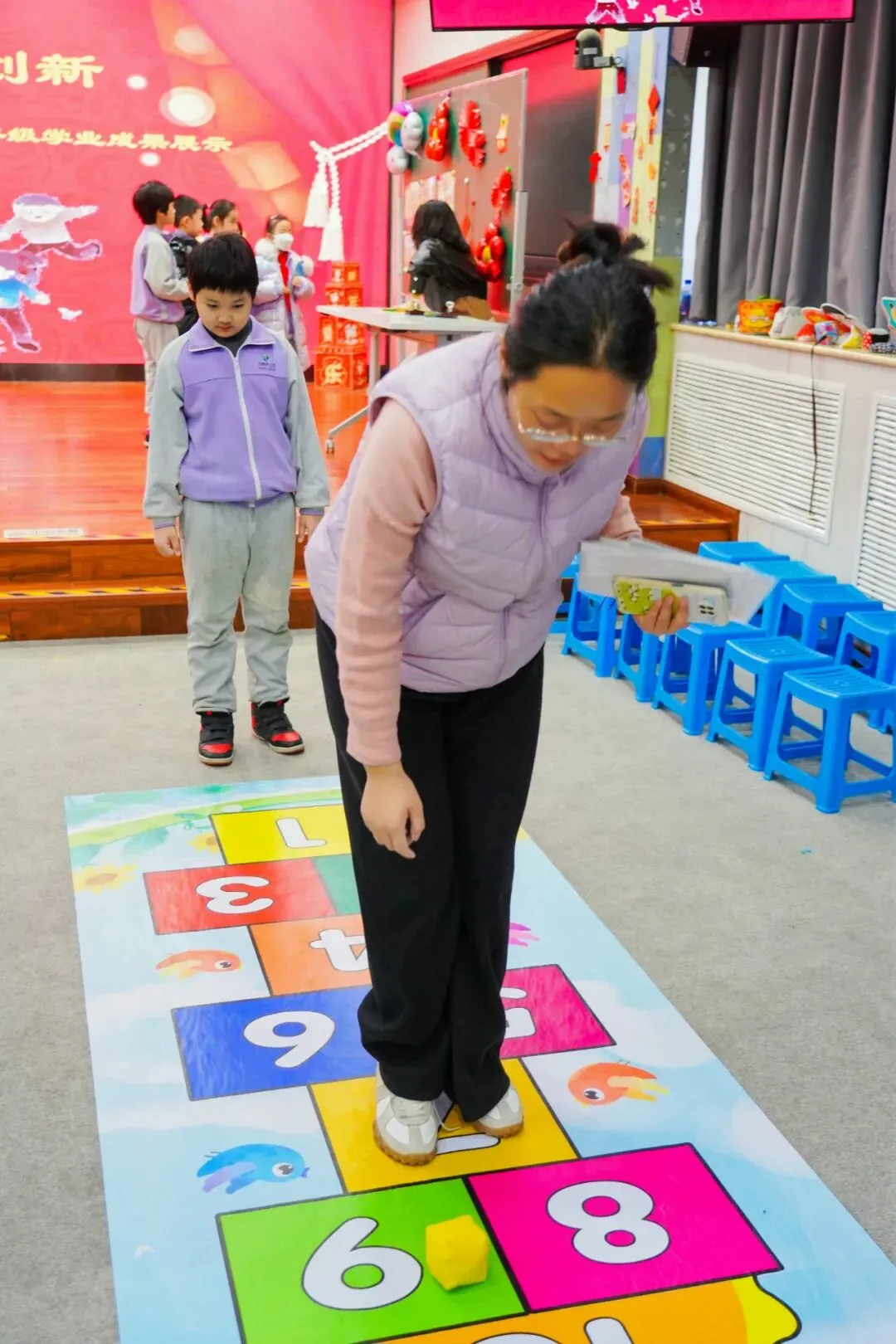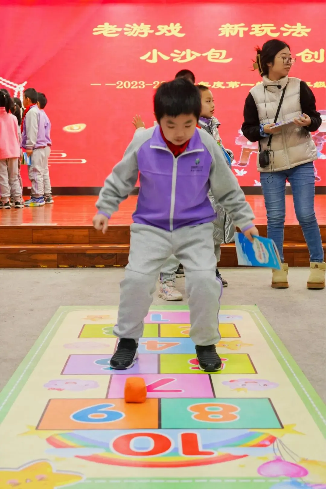 二年级的哥哥姐姐们也不甘示弱,背古诗、看图猜成语一个都不能少。获得游戏“通行证”的他们,兴冲冲地拿起沙包,在五颜六色的格子间体会游戏的趣味。