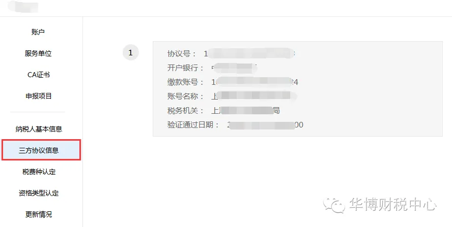 三方协议信息是纳税人与税务机关和开户银行签订的《委托银行划缴税(费)款三方协议书》(简称“三方协议”)信息。