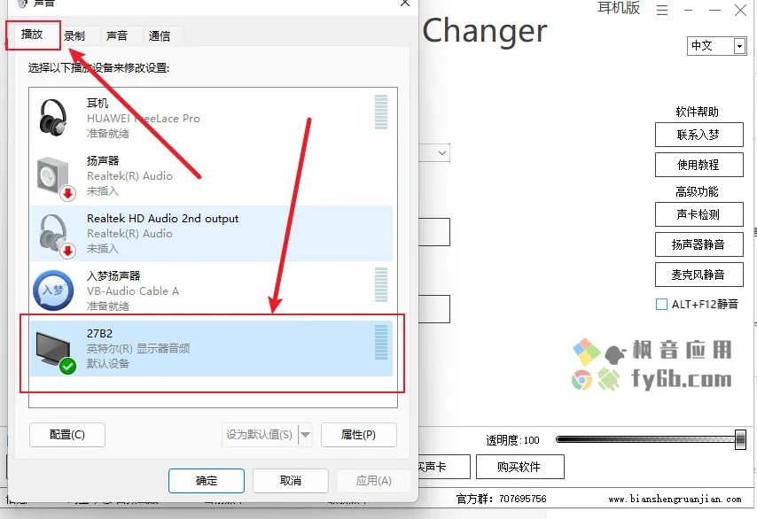 逻辑也很简单,在播放栏选择要播放的设备为默认设备,切记在这一栏不要变动“入梦扬声器”。