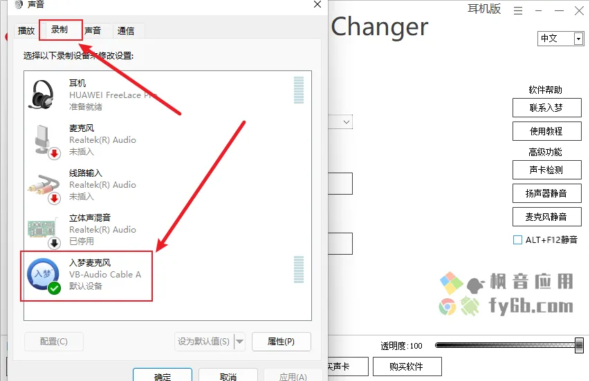 而在“录制”界面,将“入梦扬声器”设置为默认值,到这基本上就要结束了,只差一步了