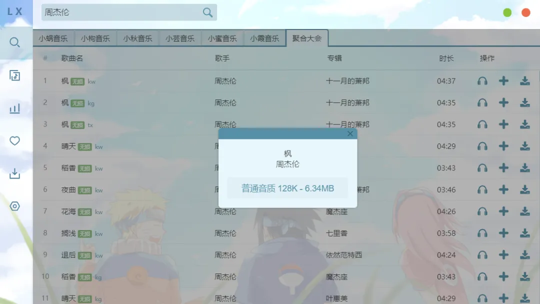 这里还是以杰伦为例,直接搜索【周杰伦】,出来的都是最新的需要付费的单曲,不过这里都是可以免费听的。而且全都是清一色的无损音质。
