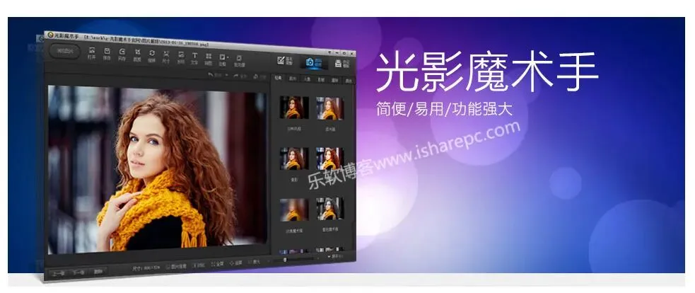 光影魔术手,一款经典的国产图像处理软件,它功能强大,简单易用,支持包括色彩调整、数码补光、自动美化等数十种图像调整工具,同时还提供了“数码暗房”,内置各种不同风格的滤镜,一键应用,更提供了诸如水印、文字效果、拼图、边框等实用的工具与素材,让你简单几步即可快速处理图像。