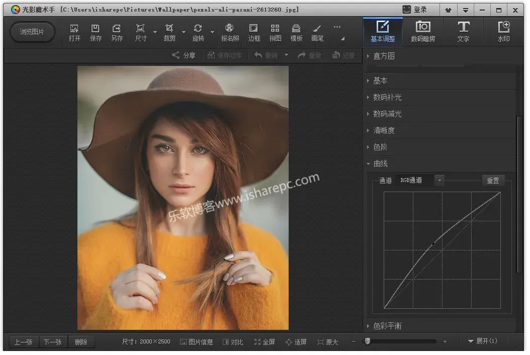 在导入图像后,你就可快速通过右侧菜单执行调整动作,比如曲线,可以快速调整图像的明亮。