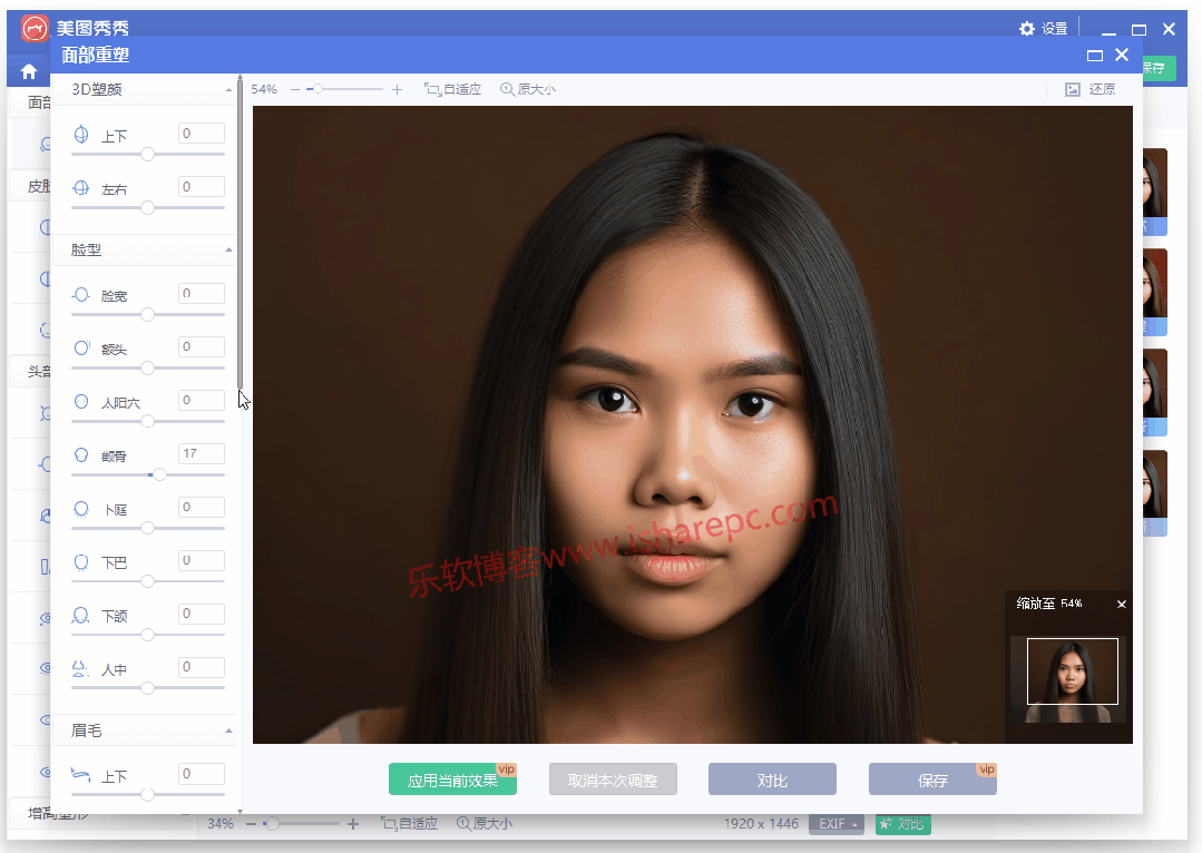此外,它还提供了头部调整和增高塑形,比如在头部调整里,你可调整眼睛大小、可以去黑眼袋、消除红眼,甚至是美牙齿。每一项都简单易用,而且效果非常好。