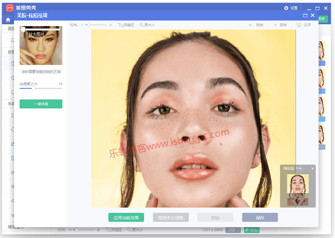 比如祛斑小工具,通过“祛痘笔”来点选图片中的斑点就可以实现消除,效果好而且速度也快。