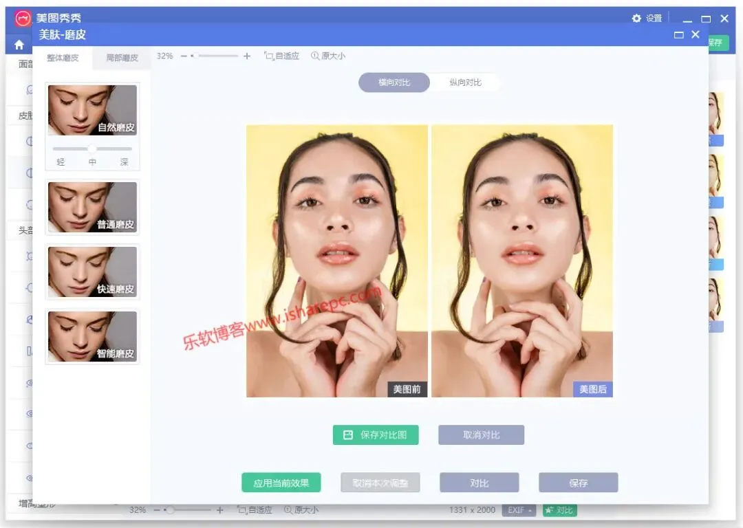 比如磨皮,在Photoshop中步骤复杂,一般人难以调整实现,而且美图秀秀中,可以一键磨皮,它还提供了自然、普通、快速和智能磨皮,