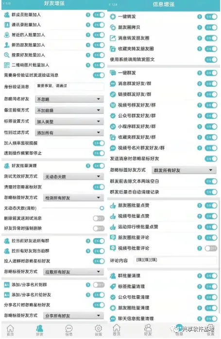这是一个第三方软件,通过安卓系统的悬浮窗实现对微信一系列的自动化操作,支持一键加人、清粉、群发、转发、评论点赞朋友圈、视频号等等功能,功能十分详细丰富,直接看图就知道了!软件没有任何付费,直接下载给予相应权限然后手机号码登陆就可以进行对应操作了!大家不用担心风控,因为不是修改微信实现,纯粹利用安卓系统的功能模拟真人点击操作,所以妥妥的放心使用吧!