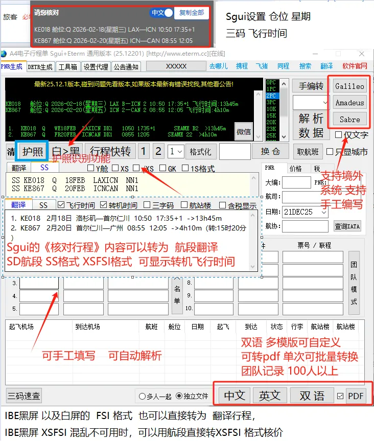 9.关于护照识别软件说明,前几个新版版已经支持转换白屏导入格式,预定航段后可以直接转为Sgui的 ctct 和ctcm格式,直接导入即可封口生单!