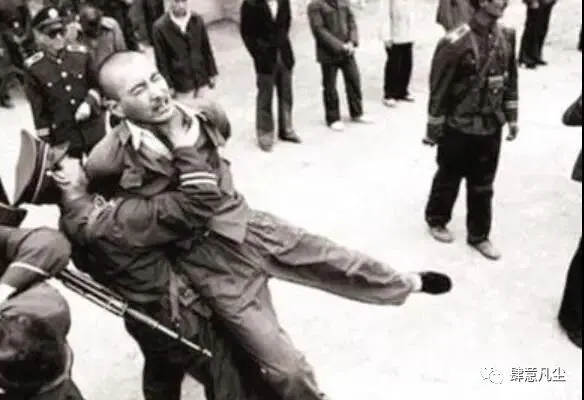 图为一名罪犯即将被押上刑车执行枪毙,这名罪犯开始想挣脱,被看押的警察一下子抱起制服。