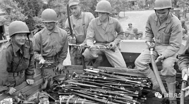 盟军战士收缴了大批鬼子军械,其中仅指挥刀就收缴了上百把。