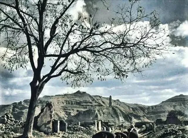 延安宝塔远处的景象 , 周围都是被炸毁的建筑。