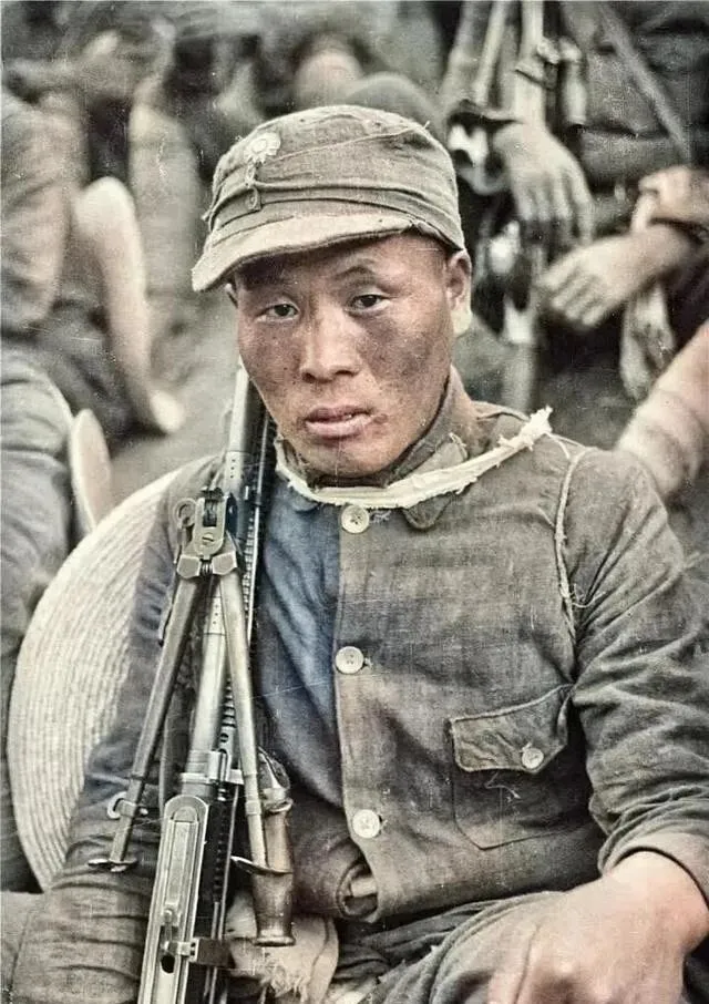 手里端着捷克式轻机枪 , 眼神像刀子一样。