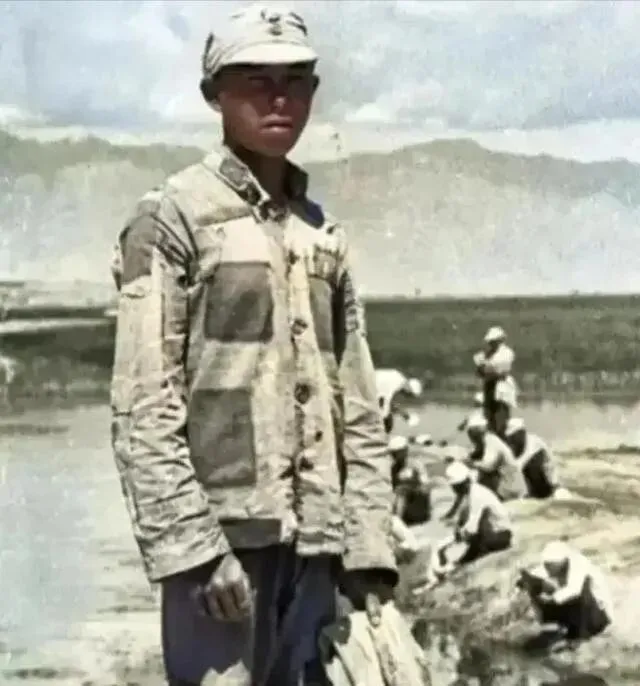 补丁衣服、破旧军装、瘦削的脸、坚定的眼神。
